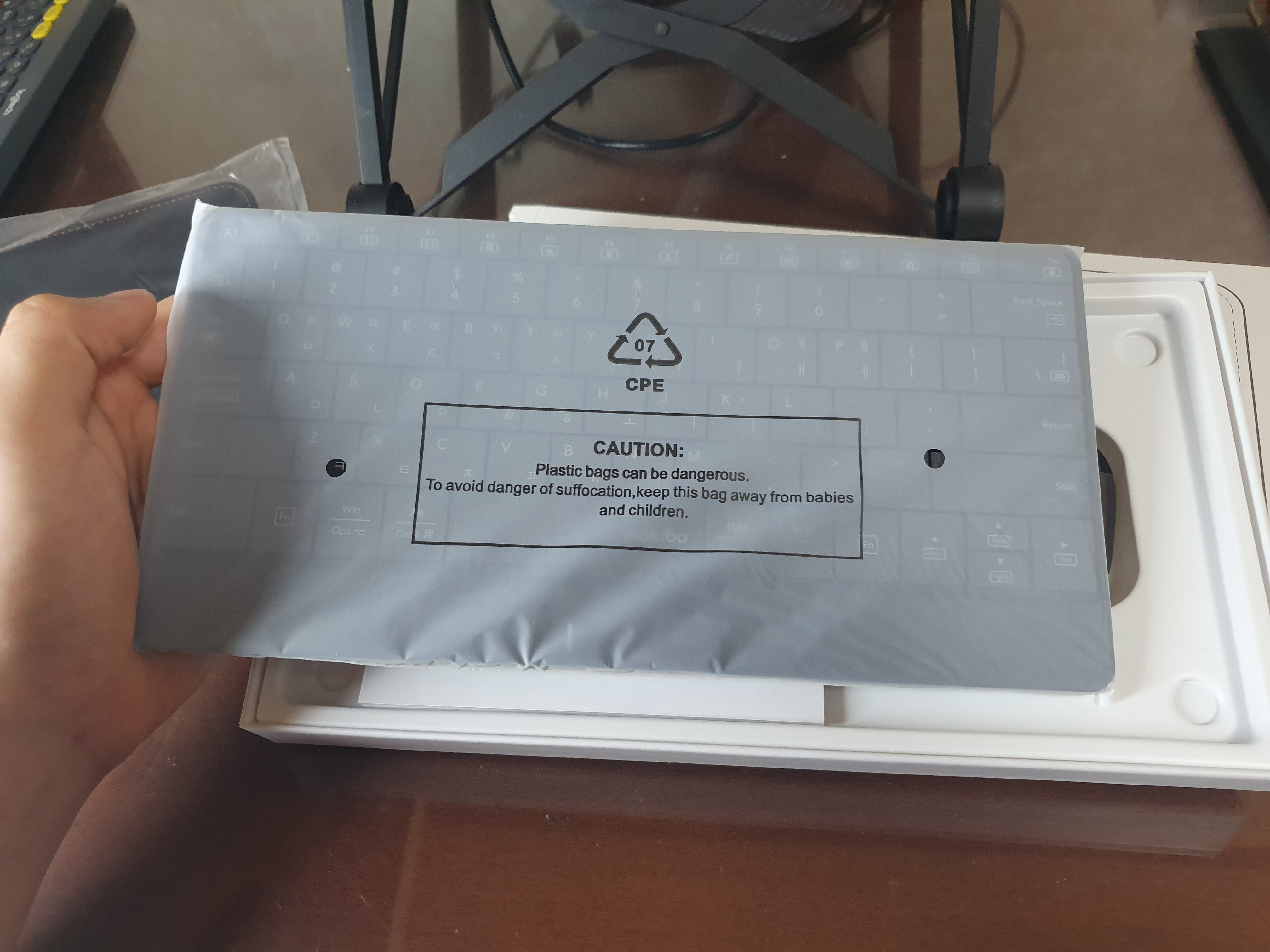 박스를 열면 에어캡 한겹에 감싸져 있는 키보드가 보입니다.