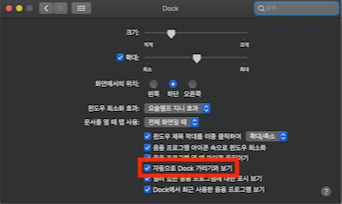 환경설정-> Dock->자동으로 Dock 가리기와 보기