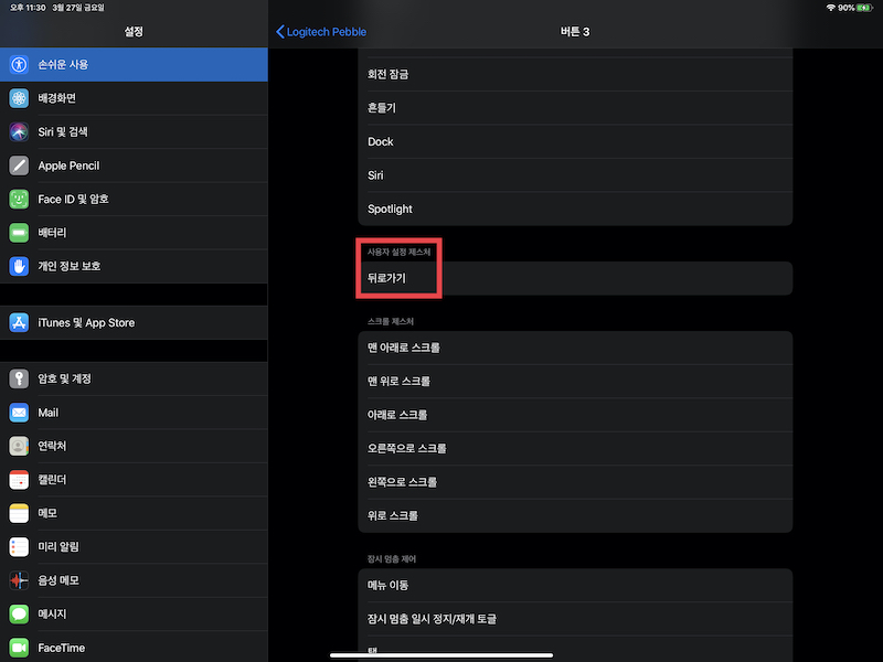 들어가서 밑으로 내려보면 사용자 설정 제스처에 [뒤로 가기]가 보이실 겁니다. 이걸로 설정합니다.