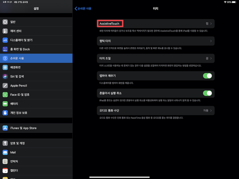 우선 [설정->손쉬운사용->터치->AssistiveTouch]로 들어갑니다.