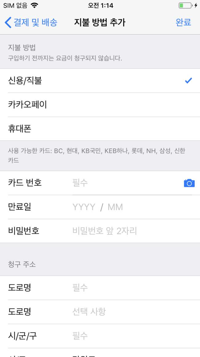 만약에 휴대폰에서 신용/직불카드 등록이 안되실 경우 애플 홈페이지에서 등록하시면 됩니다.