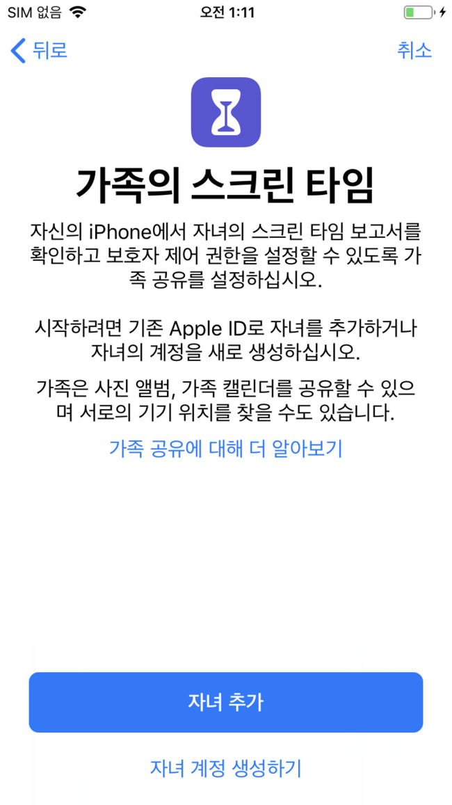 모든 절차를 완료하시면 자녀 계정이 생성되고, 그 후 자녀 계정으로 아이폰에 로그인해서 사용 하시면 됩니다.